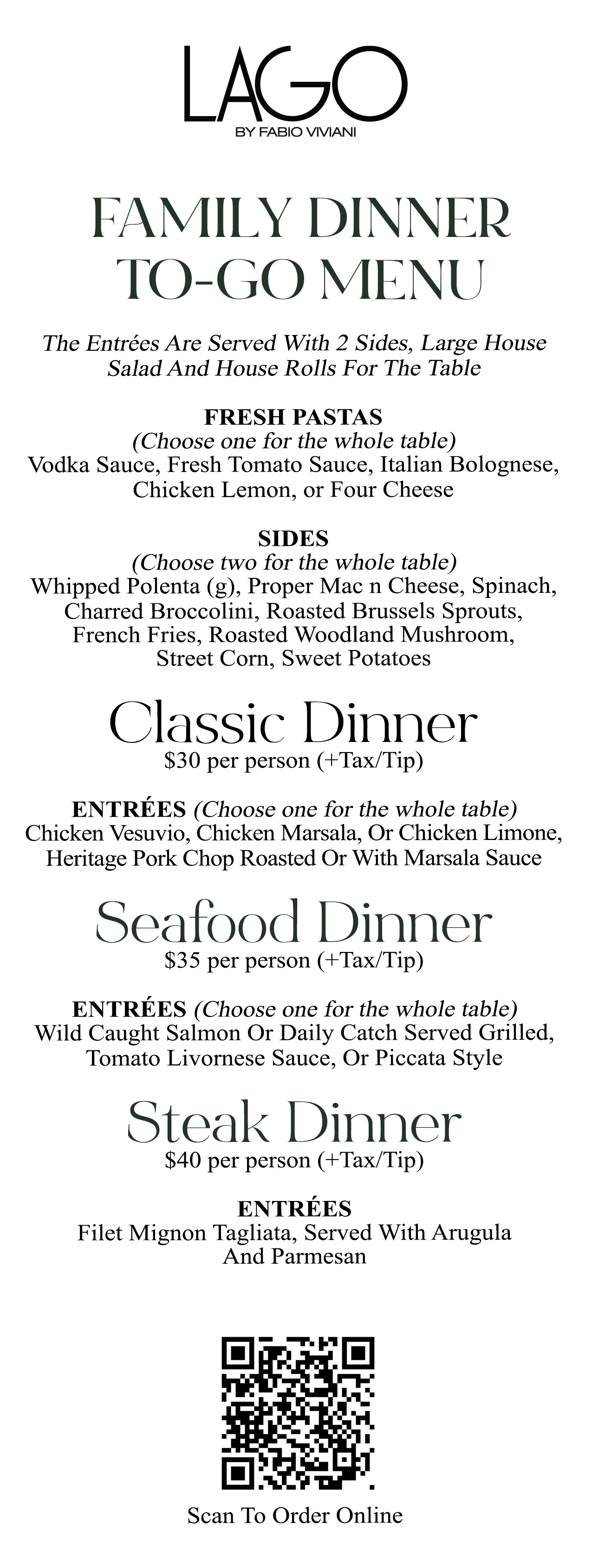 LAGO by Fabio Viviani invites you to the Sunday Family Dinner. Each week join us for classic chicken, seafood, and steak entrees — served family style. Enjoy two sides, your choice of fresh pasta, and a house salad.