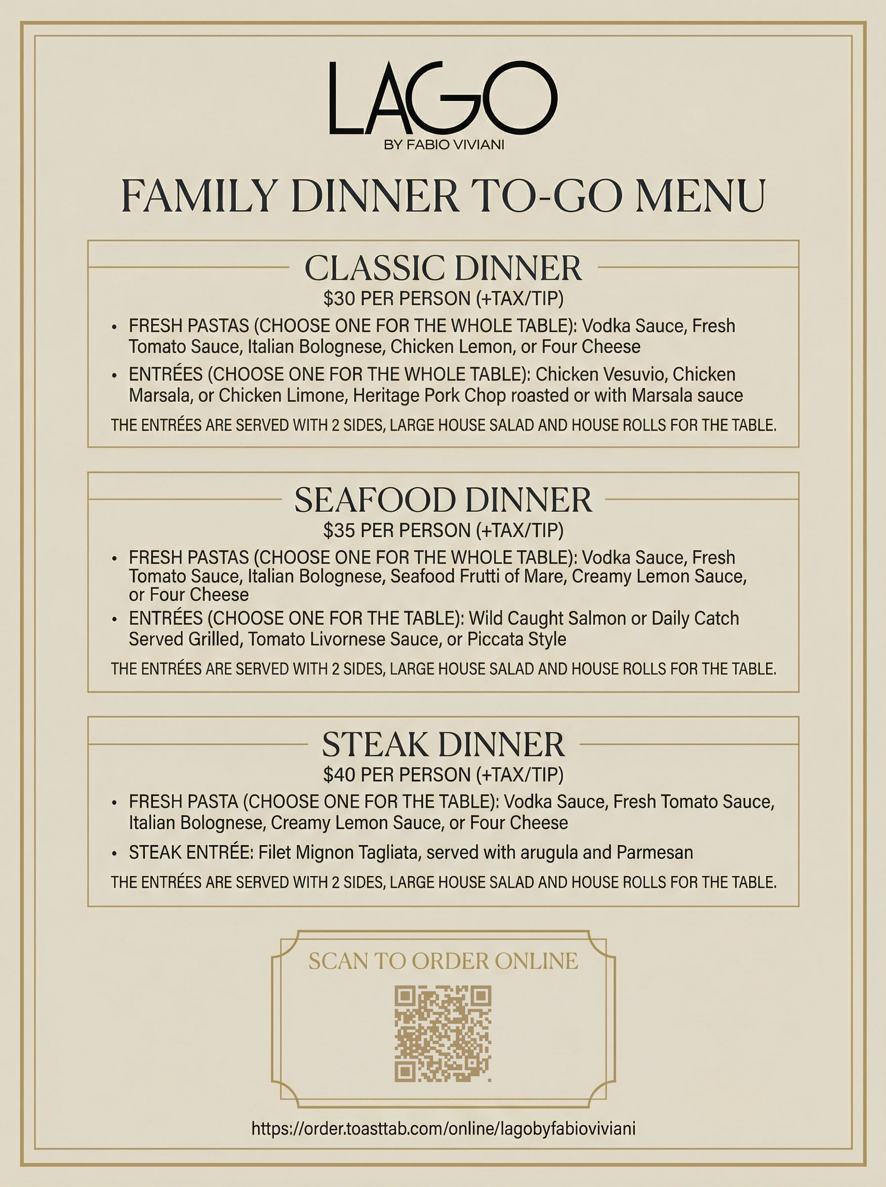 Lago by Fabio Viviani invites you to "The Italian Family Dinner Experience". On Sunday, join us for anItalian Family Dinner in-house, or enjoy afamily dinner take-out any day of the week